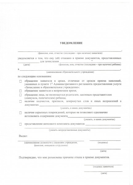 Приложение 3 к Положению о правилах и условиях приёма граждан. Уведомление об отказе в приёме документов, предоставленных для зачисления..jpg